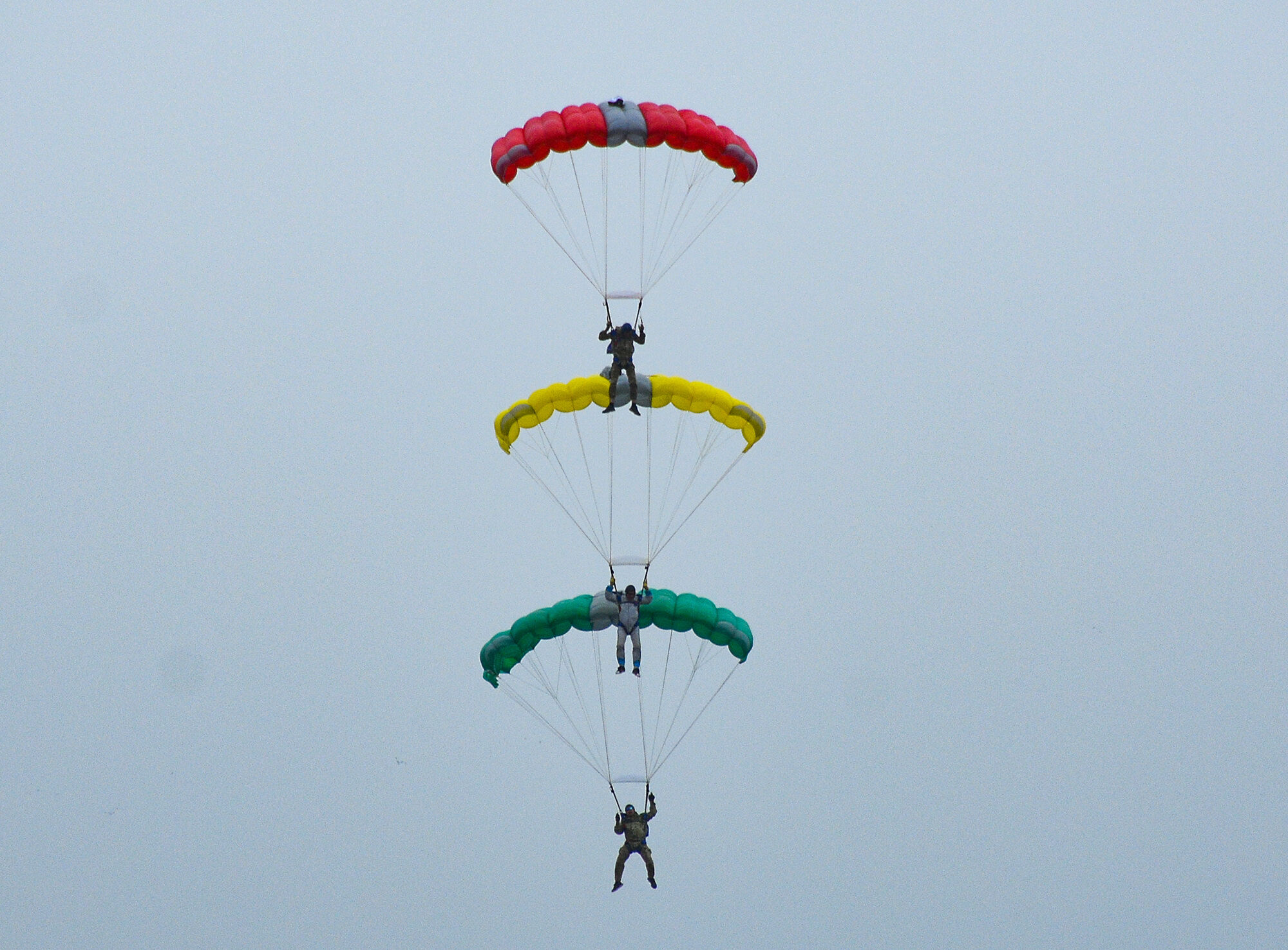 С 2,5 тысячи метров на землю спускается “этажерка”. Это парашютисты Сергей БОЛОТНОВ, Александр ТЕРЕНТЬЕВ и Вячеслав ЛИ на разноцветных куполах выстроились в вертикальную линию. Ближе к земле, и зрители выдают восторженное “ах!” - да они же сидят на парашютах друг друга! Вячеслав ТАХАЕВ со свистом проносится на своем “велике” - это высокоскоростной парашют velocity competition. Почти болид в небе: скорость наверху около 140 км/ч, у земли - около 80!