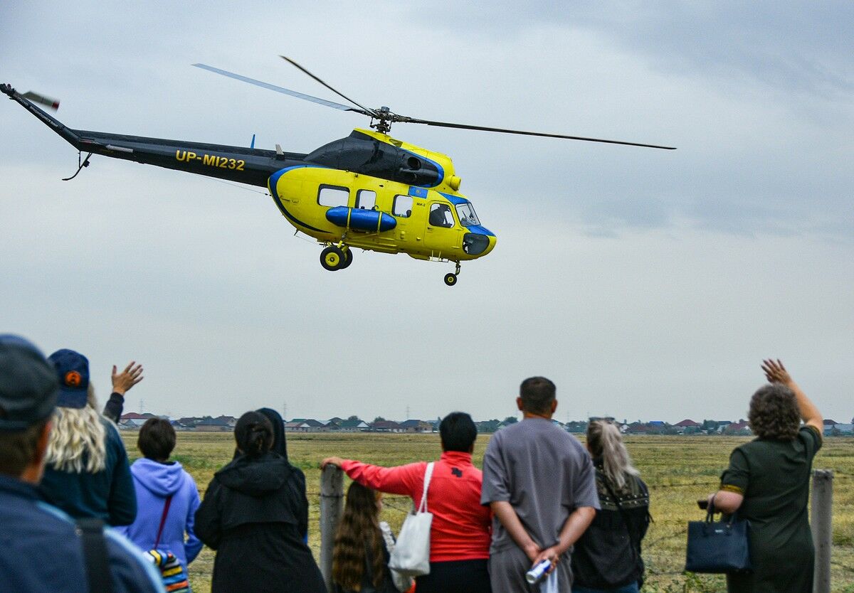 В небе облака, но народ зря волновался: ни жары, ни слепящего солнца, знай лови в небе эффектные кадры. Пилоты о сложностях не говорят - профессионалы. До полета - ни фото, ни интервью. Но мы уже знаем - в небе выписывают кренделя наши казахстанские легенды. Вот мастер спорта Владимир АНЦУПОВ - он освоил полеты на семи типах летательных аппаратов, легких самолетов и вертолетов. Сначала он на Ми-2 проносит флаг Казахстана, открывая авиашоу. А потом на этой же машине показывает все, на что способна “птичка”: делает “гуся” и “рюмку”, зависает и вращается в небе и пролетает над трибуной на высоте всего 15 метров!
